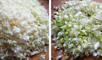 1、 把白菜洗淨控乾水份,剁碎,白菜要儘量剁得細一些,然後加少許鹽拌勻醃製5分鐘,把白菜的水份煞出來。