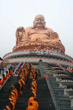 溪口彌勒大佛景區 奉化素以“彌勒聖地”著稱,宋代以來就被佛教界一致公認為彌勒化身布袋和尚的故鄉。據史料記載,布袋和尚法名契此,因長於奉化長汀村,故號“長汀子”,後人傳其為彌勒佛的化身。布袋和尚出家後,常來風景秀美的雪竇山,與雪竇寺結下了深厚的歷史淵源。彌勒佛道場雪竇古剎在南宋時被稱為“天下禪宗十剎”之一。