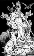 奧丁和弗麗嘉作為阿斯加德的眾神之王,奧丁的皇座位於神聖的克利塔斯克夫(Hidskialf)。傳說其為五十歲左右,身材高大,失去一目,頭戴寬邊帽,冰冷又嚴肅的人物。他肩披深灰的斗蓬,斗篷邊鑲著閃耀的星辰,頭戴藍如晴空的闊邊帽子, 反映著天際夕陽的餘輝。 深炯有神的單眼透視著生與死的神秘。手中拿著由世界之樹-Yggdrasil樹枝作成的長槍--Gungnir(岡格尼爾)[其他故事說是地底的侏儒所送的,此類互相矛盾的故事在北歐神話中偶爾會出現]。當Odin擲出時,會發出劃越空際的亮光,地上的人稱之為“流星”,此槍投出後必定命中。這槍是神聖的,一旦對著此槍發誓,便不能再反悔。他的手指上還戴著財富的象徵——指環Droupnir,這指環每隔九天便會複製一次。其宮殿被稱作“金宮”--Gladsheim。