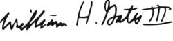 比爾·蓋茨簽名1976年11月26日,蓋茨和艾倫註冊了“微軟”(Microsoft)商標。他們曾一度考慮將公司名稱定為“艾倫和蓋茨公司”(Allen & Gates Inc.),但後來決定改為“Micro-Soft”(註:即“微型軟體”的英文縮寫),並把該名稱中間的英文連字元去掉。當時艾倫23歲,蓋茨21歲。