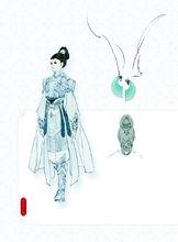 “高高的髻,絹帛剪裁的花勝牢牢貼住髮鬢,銀白色的額飾嵌了月牙碧玉”