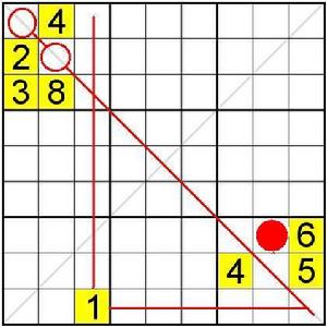 我們看第五宮上的8不在對角線上,然後觀察到第七宮的8也不在對角線上。因此第三宮內的8隻能在對角線上。再利用簡單的排除法,可以確定8在紅圈位置。