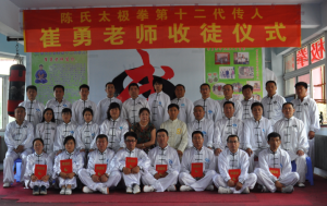 崔勇1999年開山收徒,2007年制定“三好四高”弟子條件。即:“三好”1、人品好、2、年齡好;3、形象好(必備條件);“四高”1、學歷高、2、職務高、3、收入高、4、武功高(具備其中一條)。至今已收弟子17批,整頓後確定75人。(照片12)很多弟子是當地太極拳傳播的領軍人物。如四川弟子吳蓉、北京弟子郭忠乾、俄羅斯弟子高洪