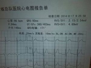 如去甲腎上腺素、血管緊張素、皮內素、炎症細胞因子、醛固酮等增加,作用於心肌,使心肌細胞重塑,引起心肌細胞肥大;細胞肥大導致左室表面積增加,產生的電偶數目增多,粗大的心肌細胞內部電阻減小致使左室除極產生的電動力增大,投影在左室面導聯上,QRS波振幅異常增大。