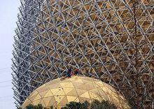 資料顯示,鎮江“巨蛋”高48米,最大直徑38米,與地面傾斜達23.5度,通透的“蛋殼”嵌著一個直徑28米的“蛋黃”。這個417噸的龐然大物裡面沒有一根支柱和橫樑,全憑自身牽引力達到平衡支撐。