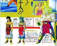 | 超級賽亞人 此形態戰鬥力是常態的五十倍,根據鳥山明的最新資料變身超級賽亞人與體內的S細胞有關,首先必須要讓S細胞達到一定程度加上憤怒之類的情緒刺激S細胞瞬間增加。 | 藍綠色版(≠超級賽亞人之神超級賽亞人) 布羅利最初登場超賽形態,頭髮變成藍綠色渾身燃燒著金黃色的氣息(頭箍限制布羅利一口氣提升戰鬥力),這時能力被壓制,但後來出現時已經沒有了頭箍,所以布羅利變成了正常金色版。此狀態布羅利可以無視貝吉塔(超級賽亞人全功率)的攻擊。 | 藍綠色版 |