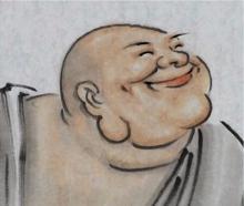 他的整個一生只做了一件事,那就是笑,那就是他的信息,他的信條,他的經典。在日本,沒有誰像布袋和尚那樣被人在記憶中如此地尊敬。人們與這位在每一間屋子裡陳設的布袋和尚塑像面前,感受到他發自內心的如此深刻笑的痕跡,他的笑駐留在每個聽見笑聲的人的心中,他的笑扣動了他的本性,他的笑更創造出了一種人類的共鳴。