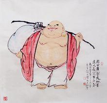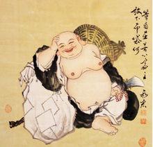 國畫布袋和尚照片集錦梁貞明二年(九一六),布袋和尚端坐在明州岳林寺東廊下的一塊磐石上, 將入滅前,說了一偈:“彌勒真彌勒,分身千百億,時時示時人,時人自不識。”說完安然坐化。