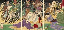 平清盛受地獄景象和鬼魂的困擾平清盛死後,由於其嫡子重盛先已病死,次子平基盛也早已夭折,領導平氏一族的大位就由三男平宗盛來接班。然而,平宗盛缺乏其父的才幹,也不具其父的強悍個性,因而完全無法應付全國各地接連不斷發生的反抗變亂。再者以法皇為中心的院政勢力再次復甦,也逐漸侵蝕平家的基礎。再加上恰於此時發生饑荒(養和大饑荒)此一不利條件,在此種種因素交織下,平氏一族先是在壽永二年(1183年)的俱利伽羅卡之戰大敗於源義仲,平家大軍因而崩潰,無計可施之下不得不自京都撤出,最後在文治元年(1185年)的壇之浦之戰戰敗滅亡 。