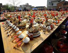 宗台上的三牲必有閹雞,當宗台數量非常之多時,會出現百雞拜神的盛況,謂之百雞宴。“百雞宴”,即是每家每戶宰殺一隻大閹雞,煮熟的胖鼓鼓、金油油的雞整齊集中擺在宗台上敬神,雞頭都朝向同一個方向等待神的恩賜,數十乃至數百張桌子上都有閹雞,擺放方式整齊劃一,場面蔚為壯觀。