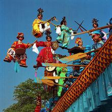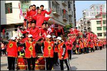 高州八音鑼鼓八音是廣泛流行於中國南方的古老樂種之一,屬民間音樂。因使用8 類樂器而得名,即:弦(二胡)、琴(月琴、揚琴、三弦)、笛(嗩吶、嘀嗒)、管(長、短喉管)、簫(橫簫、直簫、洞簫)、鑼、鼓、鈸等. 演出時由兩人也有多人抬著一架彩綢、花串、球穗、圖案等裝飾的鑼鼓亭,按打擊樂、管弦樂的順序,邊行邊演奏,曲調高昂洪亮,演奏時周而復始,鏇律歡快,氣氛熱烈而流暢。其樂曲因場合不同而異。游神時它一般跟在神的後面,它那“咚咚”聲源遠遠便可入耳,很多人根據鑼鼓聲的大小來判斷是否到自家擺醮的時候了。
