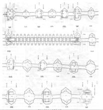 廣濟橋[最早的啟閉式橋樑]廣濟橋的欄桿造型簡單,梁橋部分是常見的橫條式石欄桿,豎向立柱加上橫向的扶手條。浮橋部分為木質欄桿,分段獨立再用鐵鏈連線,每段都是六根豎向立柱加二根橫向扶手條。欄桿處在兩舟之間,在防護的同時也起連線二船作用。石欄桿四根橫條都是正方形的小石條,其中第一、二和第四條正面擺放,第三條改為側面擺放,變成一條棱形條。