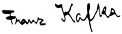 卡夫卡的親筆簽名卡夫卡作品的基本主題是現代社會中人的異化和孤獨,如長篇《城堡》、《審判》、《美國》和中短篇《變形記》、《地洞》、《判決》、《在流放地》、《桶騎士》、《萬里長城建造時》等等。這些作品的基本主題是現代社會中人的異化和孤獨感。但它並非通過傳統的寫實或典型化的手法獲得的,而是突破了表象的或細節的真實,採用鮮明的象徵、淡化的情節和寓言性質的人物,通過象徵、暗示、誇張等手法予以表現。