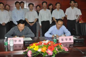 源市商務局局長張興堂(左)與西華大學管理學院長章道雲簽訂《萬源市物流產業發展規劃編制合作協定》 一九七O年二月至一九七五年八月讀國小