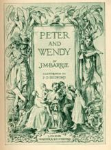 1911英版小說封面《彼得·潘》寫的是達林先生家裡的三個小孩,經受不住由空中飛來的神秘野孩子彼得·潘的誘惑,很快也學會了飛行,趁父母不在,連夜飛出窗去,飛向奇異的“夢幻島”。這島上既有兇猛的野獸,又有原始部落中的“紅人”,還有可怕的海盜,當然還有仙女和美人魚,總之,經常出現在兒童夢中和幻想中的一切,這裡都有;因此也就有與猛獸搏鬥的打獵,有紅人與海盜之間或孩子們與海盜之間的真正的戰爭。孩子們脫離了成人,無拘無束,自由自在,在彼得·潘的率領下,自己處理一切事務,盡情玩耍,也歷經了各種危險。正如作者在書中所說:“在他們看來,沒有媽媽照樣可以過得很愉快。只有當媽媽的才認為,孩子離開了媽媽便不能生活。”可是後來,這些離家出走的孩子——尤其是其中的大姐姐溫迪,開始想媽媽了,在她的動員下,孩子們告別了給他們帶來過無限歡樂的“夢幻島”,飛回了家中。後來他們都長成了大人。只有彼得·潘永不長大,也永不回家,他老在外面飛來飛去,把一代又一代的孩子帶離家庭,讓他們到“夢幻島”上去享受自由自在的童年歡樂。作品的最後一句是這樣寫的:“只要孩子們是歡樂的、天真的、無憂無慮的,他們就可以飛向夢幻島去。”