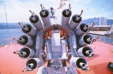 近防飛彈,“長手套/劍”SA-N-9垂直發射近程防空飛彈,在艦體前、後段各設有2座垂直發射裝置,每組8個發射艙,每艙備彈8枚,總計備彈128枚。SA-N-9近程防空飛彈屬俄羅斯新型防空飛彈,用於取代SA-N-4艦空飛彈。飛彈射程45千米,飛行速度2馬赫,戰鬥部重15公斤,採用指令制導和主動雷達制導,採用六聯裝垂直發射裝置和“十字劍”火控系統。可同時發射12枚飛彈,迎擊12個空中來襲目標 。