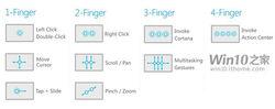 Win10中新增的觸摸板手勢如圖所示,其中的三手指和四手指點擊操作分別對應著調用Cortana和操作中心功能。