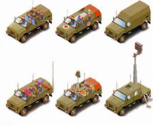 “野狗”2具有較大的載荷和內部空間,使得該車能夠執行多種任務。該車可作為輕型偵察車、運輸車、指揮控制車、武器運載車、貨車、救護車、輕型防空車和前線觀察車等。當作為前線觀察車時,將需要安裝可伸縮桅桿,桅桿上安裝有感測器組、白天/熱成像觀察設備和護眼型雷射測距儀等設備。