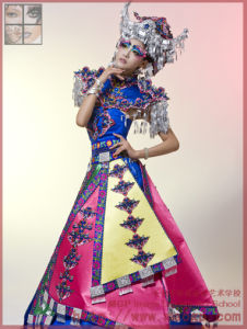 靈感來源於苗族特有的苗銀,及其獨特的色彩元素,為了充分體現苗族自身特點,所以裙身大量採用其五彩繽紛的色彩以及其特殊而具有代表性的苗銀。