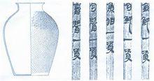有關陶瓷質地的標準,一直是考古工作者爭論的焦點。馬王堆漢墓竹簡《遣策》記錄的名稱中將不同陶器分別稱之為“土器”和“瓦器”。也有個別學者把《遣策》中的“資”確定為“瓷器”的。《說文》中沒有“瓷”字,也就是說,馬王堆竹簡中的“資”可能是我國最早的“瓷”字。