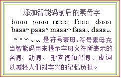 如左圖,假設第一行拉丁體拼音形聲字依次是全碼字中的名詞、動詞、形容詞、代詞、虛詞,全碼字的形音意已經固定下來,輸入碼同樣是唯一的,但每個字的最後一個表義字母“a” 所表的詞類不明顯,學用時只能靠記。第一行字在啟用智慧型碼的狀態下輸入電腦就不同了,這五個字會由電腦自動添加上智慧型碼,顯示成第二行帶智慧型碼並依次表示名詞、動詞、形容詞、代詞、虛詞的的素母字,這對記字義很有幫助。詞類識別符同時還有分隔位元組的作用。