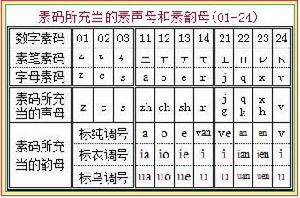 素字的聲母用素碼充當,素碼“01-04、11-14、21-24、31-34、41-44、51-54”依次充當漢語拼音聲母“z c s i、zh ch sh r、j p x v、b p m f、d t n l、g k h u”。其中“i 、u”在素字中兼作聲母,“v”作零聲母,凡韻母獨立為音節的,前面要加零聲母,每個音節都規範地由兩個素碼組成。聲母“j p x”和“g k h”所拼的韻母不同,在全碼拼音形聲字中可以同時用高頻使用鍵“21 22 23”輸入電腦。但在簡碼字中由於韻母被簡略,“g k h”必須用“51 52 53”鍵輸入。在字母拼音形聲字中,漢語拼音聲母“zh ch sh” 寫成“a o e”。“a o e”在聲位上作聲母,在韻位上作韻母,其它的素聲母與漢語拼音的聲母相同。