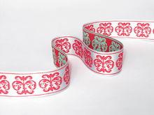 提花帶是時尚和新潮的織帶工藝,外觀立體精美,多織出花、鳥、魚、蟲、飛禽走獸等美麗圖案。品牌提花,標誌清晰可見,色澤鮮艷,很有檔次,既可增加產品附加值,又能提升品牌形象。提花帶圖案精細,手感柔滑,強性好,經久耐磨,色牢度高,永不變形。經提花帶的圖案相對簡單,較單一,而緯提花帶的圖案幅度大且精美,色彩層次分明立體感強。