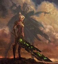 她對帝國忠勇有加,以至勃朗·達克威爾親自授予了她一柄黑石符文之刃,一位皮膚蒼白的內閣女魔法師還為此劍附了魔。這把武器甚至比一面鳶盾還要重,劍身也幾乎與盾同寬——正合銳雯的胃口。