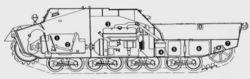“犀牛”自行反坦克炮的戰鬥全重為24噸,比基型車TⅣ坦克重了4噸多。乘員為4人。車全長8.44米,車體長5.8米,車寬2.86米,車高2.65米。從圖中可以看出,由於戰鬥室下部布置了燃油箱等,再加上炮架布置在動力艙的上部,使車高抬得很高,這也是“犀牛”自行反坦克炮的一個缺點。車體及上部戰鬥室為鋼裝甲焊接和螺栓連線混合式結構。裝甲板較薄,厚度為10~30毫米。部分車體甲板採用螺栓連線結構,也是為了便於從車上拆卸發動機。戰鬥室很寬敞,加上是頂部敞開式,乘員在戰鬥室內覺得很舒服,但頂部防護很差。運輸或行軍途中,戰鬥室頂部可罩上帆布,並用火炮固定器將火炮固定。由戰鬥室後方見到的炮長席位置如上圖所示,炮長在左側,由防危板和火炮相隔;裝填手在右側。火炮右下方的管子,用於在冬季向戰鬥室送去發動機的暖氣。儘管是頂部敞開式結構,但在車體後部仍開了兩扇小門,供乘員上下車用。車體後部下方有一個備用負重輪。