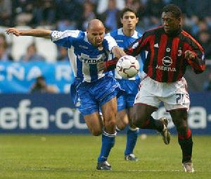 歐洲冠軍聯賽四分之一決賽第二回合,拉科魯尼亞主場以4比0大勝AC米蘭。圖為米蘭克拉倫斯·西多夫在比賽中與對方曼努埃爾·巴布洛爭搶中。成立時間: 1906年3月2日