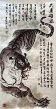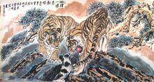 大戰雄風老虎是曠古洪荒時代為人類倖存至今得猛獸-天之驕子。千百年來虎的威猛使世人畏懼,在藝術家的筆下,展示的大都是虎的威武勇悍,兇猛殘暴和雄風馳騁之姿。如漢武帝茂陵的《伏虎》石雕是這樣,東晉顧愷之《女史箴圖》亦然,到了近代的高劍父,高奇峰兄弟,張大千兄弟以及胡藻斌等人的《虎》圖大都如此。然而朱先生的作品中《伏虎羅漢》、《伏虎說法》、《天趣》、《聽樂圖》、《和諧圖》、《醉虎圖》、《神趣》卻很難看到"王者之風"、"餓虎下山"的威武兇猛,更看不到"風從虎"的恐怖氣息。其實作畫一"道"筆墨技巧是其次,最重要的是思想。一幅作品能夠將作者的思想表達出來才是最高。朱先生筆下的虎能夠將其人性化,所表現賦予的威猛強悍的老虎以人格化的的柔情細膩,憨態玩耍,微閉著眼睛,似聽那山間的流水松濤或聽那人間的喧鬧……這正是畫家所要展現的獨到之處和畫外的高遠意境,令人為之喝彩!
