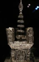 阿育王塔金棺盛裝“佛螺髻發”舍利的純銀阿育王塔一座,作為國寶級文物,這座銀塔已經收藏於浙江省博物館。這座純銀阿育王塔,塔身內用金棺盛裝“佛螺髻發”舍利,是當年吳越國王錢俶建造皇妃塔(後稱雷峰塔)的核心所在,也是他畢生崇佛的體現。純銀阿育王塔直接仿自延壽造夾紵育王塔(溫州白象塔出土的漆塔),間接仿自鄮縣阿育王塔。金棺銀塔其意義等同於金棺銀槨,是瘞埋佛舍利的最高規格。