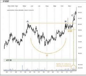 以上為例,在遇到A點的阻力位前,價格正在上升。不到六個月,杯的形態已形成,而且相遇阻力位B點。價格隨後徘徊在同一個交易價格約一個月,然後穿破阻力位,確認了杯柄形。成交量也提供了一個委明確的指標,確認這圖形的準確性。因成交量在破位前後增加,代表出現大量買家。