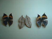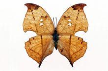 枯葉蝶標本中華枯葉蝶屬於大型蛺蝶,因為模擬枯葉而聞名於世,分布於中國的西南部和中部,以及緬甸、泰國、尼泊爾、不丹、錫金、印度;喜馬拉雅山的低海拔地區。國內分布於陝西、四川、江西、湖南、浙江、福建、廣東、台灣、海南、廣西、雲南、西藏。 比其它蝶種數量少,分布區域狹小。雙翅合併後酷似一枚枯葉,依次由褐色、橙黃色、金屬藍色將蝶翅正面三等分,後翅基部為金屬藍色,外圍褐色。中國的四川峨眉山及雲南西雙版納出產較多,但四川產不如雲南產的色彩艷麗。是蝴蝶收藏的高檔蝶種。