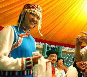 初一凌晨,全家穿上節日服裝,擺上宴席,先由晚輩給長輩敬酒,行跪拜禮。男人雙膝下跪,頭往下低時雙手上下擺動。長輩以吉祥言語作為回報。未婚女子與男人一起跪拜,而已婚女子則右膝下跪,右手在面額右側上下擺動,新媳婦則須唱歌。然後便開始外出拜年和迎接前來拜年者。人們跨上早已備好的駿馬,三五成群地奔向“浩特”(村鎮),逐個地串蒙古包。串包中,先要給長輩叩頭祝願,其後由主人家的女婿為前來串包的客人敬酒,按習慣此酒每敬必喝,通常是載歌載舞,氣氛熱烈。串包男女經常利用此機會賽馬,尤其是青年男女更不相讓,茫茫草原,縱橫馳騁,冰冷大地上奔淌著生命的熱流,預示著來年無盡的希望。