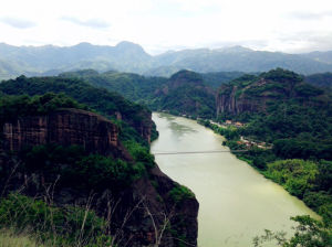 其自然景觀“上大灘十里,東南行,忽望見溪右溪石突兀,既而直逼而下,則突兀者轉為參差,為崩削。俱盤互壁立,為峰為岩,為屏為柱,次第而見。”引徐霞客讚嘆。