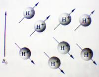 在外磁場的作用下,有較多1H傾向於與外磁場取順向的排列,即處於低能態的核數目比 處於高能態的核數目