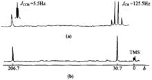 丙酮的13C譜圖13C的核磁共振原理與1H的核磁共振原理相同,因此13C與直接相連的氫核也會發生偶合作用。由於有機分子大都存在碳氫鍵,從而使裂分譜線彼此交疊,譜圖變得複雜而難以辨認,只有通過去偶處理,才能使譜圖變得清晰可辨。最常用的去偶法是質子(噪聲)去偶法。該法採用雙照射法,照射場(H2)的功率包括所有處於各種化學環境中氫的共振頻率,因此能將13C與所有氧核的偶合作用消除,使只含C、H、O、N的普通有機化合物的13C-NMR譜圖中,13C的信號都變成單峰,即所有不等性的13C核都有自己的獨立信號。因此,該法能識別分子中不等性的碳核。下圖是丙酮的13C譜。(a)是偶合譜,(b)是質子去偶譜。在偶合譜中,羰基碳( δ=206.7)與六個氫發生二鍵偶合,裂分成七重峰,α碳( δ=30.7)與三個氫發生一鍵偶合,裂分成四重峰。在質子去偶譜中,羰基碳和α碳的裂分峰均變成了單峰。丙酮有兩個相同的α碳和一個羰基碳,α碳的峰強度較羰基碳的峰強度大。質子(噪聲)去偶碳譜就是通常說的碳譜,又稱為寬頻去偶碳譜,用13C{H}表示。其它去偶的方 式還很多,有興趣的讀者請參閱有關專著。