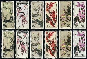 這套郵票採用中國傳統的工筆重彩表現技法,在絹上精心繪製而成,生動地刻畫出了梅花傲霜鬥雪的鐵骨精神,真乃“梅花香自苦寒來”。6枚郵票圖案的排列順序也頗具匠心1、3、5枚的梅花呈淺色(白、綠),2、4、6枚的梅花呈深色(紅),既創造了一種和諧而有變化的藝術氣氛,又烘托出了花枝的剛毅挺拔。票型採用長條幅式,並在銘記下分別蓋有一方每種花名的紅色篆印,使得郵票圖案猶如一幅幅歷代梅花名作,具有鮮明的國畫風,既點明了主題,也裝飾了畫面。正如清代揚州八怪畫家李晴江題畫梅詩所云:“觸目橫斜千萬朵,賞心悅目兩三枝。”