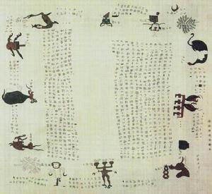 長方形絲絹,深褐色,中部墨書兩組文字,四周有有邊文和圖像,每邊三組,圖像塗有青、赤、棕三種顏色。