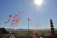 梵音裊裊,鐘鼓齊鳴,禮炮齊鳴,彩球升空主席台