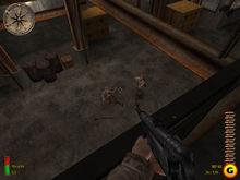 走到橫道的盡頭,有三個德軍——兩個國防軍、一個黨衛軍,其中一個國防軍在機槍掩體裡。殺不殺均可,不殺的話給黨衛軍看證件,進旁邊鐵皮門。這是個狹窄的門廊,左側有扇門,推不開。進第二道門,是一個大型倉庫的入口,一個拿著MP40的軍官正和一個技術員說話,幹掉他們。向通道深處走,快到轉彎處是看見一個雙頁門,進去,像鍋爐房,上控制台幹掉技術員,桌子上就是STG44的技術資料——新式武器是在鍋爐房裡研究出來的,值得欽佩,呵…呵…走到通道盡頭,幹掉一個哨兵和一個技術員,上高台就是STG44的成品庫了。進去把彈藥收集起來,安放炸彈,跑。