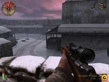 遊戲截圖8在這個部分里,遊戲對顯示卡的要求增高,地圖很大,樹林加雪花,如果出現跳幀,只能降低顯示卡設定了。頭幾個小任務是炸掉敵人的火炮後到達一個地方再繼續下面的任務,按照左上角的羅盤指示的方向找到高射炮,第一階段炸毀兩個,在第二階段炸毀最後一門炮後,向集合地點靠攏,任務就完成了。
