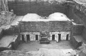 墓室前東西兩側向南伸出長為2.9米的擋土牆,門前地面經過硬化加工,以象徵地上庭院。墓門外側砌築封土磚牆,封門磚上放置有與祭祀有關的青瓷罐、釉陶獸形水注、五銖錢等物品。