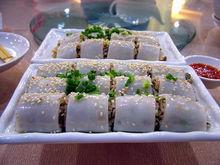 豬腸碌豬腸碌與粉卷相似,但餡是黃豆芽、炒粿條等做成的,以整張的粿條作皮來包裹。有人又叫豬腸粉、腸粉(由於現在腸粉用來指另外一種點心,陽江人已經很少人用“腸粉”來稱呼豬腸碌)。它類似平時吃的粉卷,用米粉皮包著芝麻、豆芽、蝦皮、蛋皮等。吃的時候可整條吃,也可以切成小段,再沾上特殊的調料(如辣醬)。 乾炒粿條的配料可按個人喜好,可用蛋炒粿條、鮮蝦仁炒粿條等,但正宗的豬腸碌一定用黃豆芽和蒜。