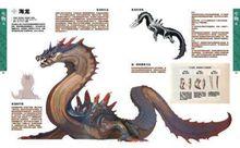 海龍圖冊海龍是生活在溫帶淺海與熱帶河流中的大型海龍種怪物,也是最早被發現的海龍種怪物。身體背面覆蓋青藍色甲殼,腹面長有細緻的乳白色皮甲;頭頂長有一對短粗的褐色犄角(可放電),吻部較長牙齒短粗,脖頸較長關節靈活;背部長有五對褐色的放電器官,第一、二對最長其餘較短;四肢向外伸展,前肢生有四指,後肢三指;尾部呈灰黑色,粗壯,側扁,有鰭狀結構。成年個體身長可達25米以上 。壽命70到100年。