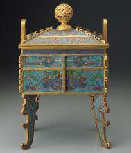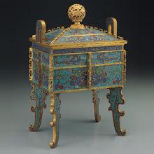 清乾隆掐絲琺瑯獸面紋方鼎(圖2)造型花俏的鼎形器,鏤雕龍紋球形蓋鈕,拱門式立耳,器腹中央及四角都裝飾稜脊,與著名的周文王鼎在形制與紋飾上均相若。此類器物到了後期,也成了祭祀中的禮器或做案頭的陳設器。