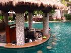 游泳池5.池邊滿鋪不浸水綠色地毯,設躺椅、坐椅餐桌,大型盆栽盆景點綴其間。