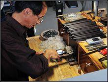 擇筆也是分揀毫毛的一道工序,讓製成的半成品毛筆筆頭在乾燥狀態下散開,一手握住筆桿,一手拿著修理工具,迎著光線把沒有鋒穎的筆毛揀去。