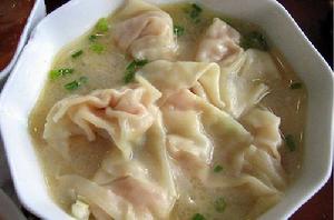 4.旺火沸水放入抄手,入鍋後持瓢沿鍋邊輕輕地伸至鍋底部將抄手推轉,抄手浮起後,稍稍淋點冷水,稍過片刻,一見抄手皮起皺、發亮即熟、加上用豬蹄、肘及雞熬制的原湯,其味更佳。